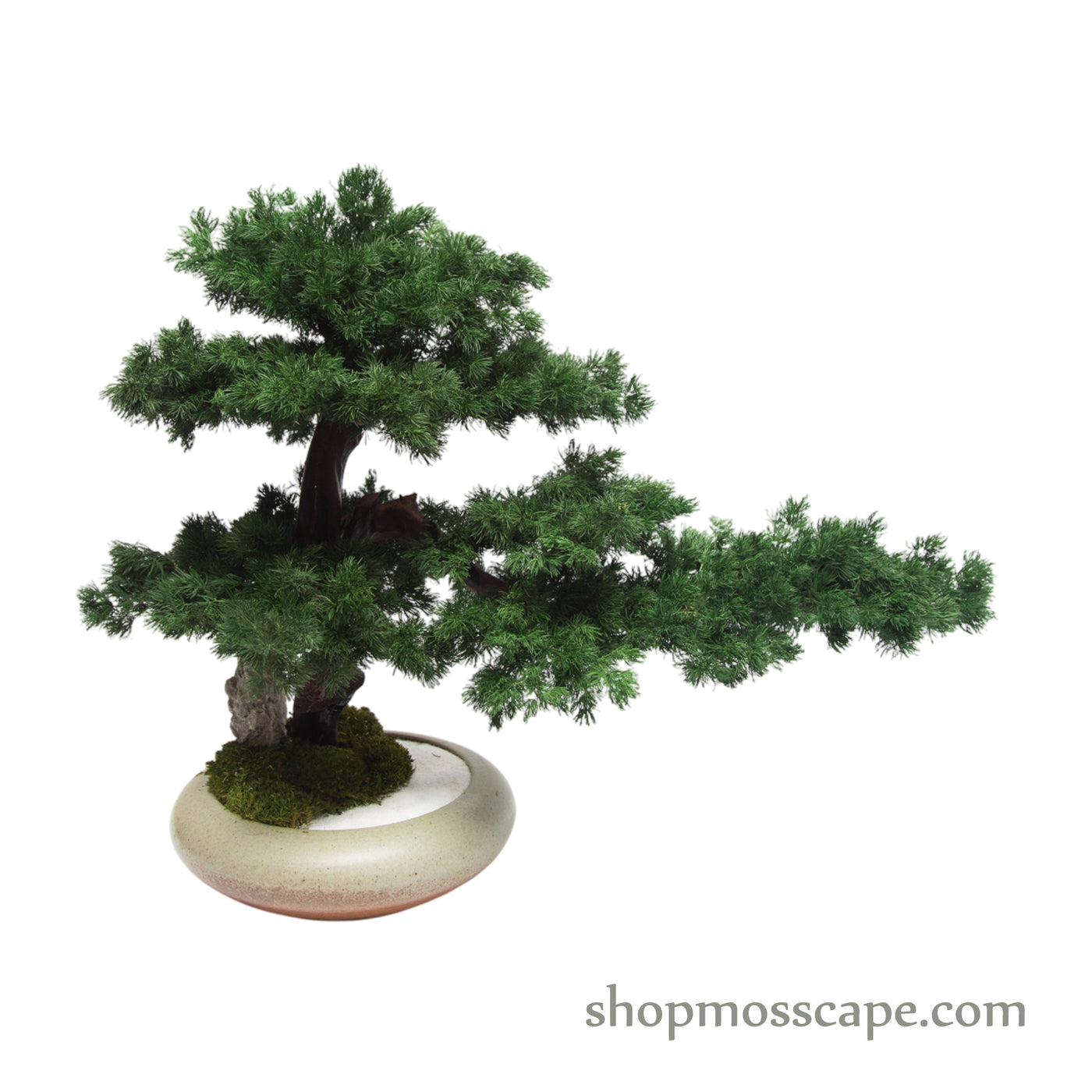 This bonsai feels both meditative and architectural—an ideal living accent that brings balance without overwhelming its surroundings. Its rich green tones contrast beautifully against neutral interiors, making it a timeless statement piece.